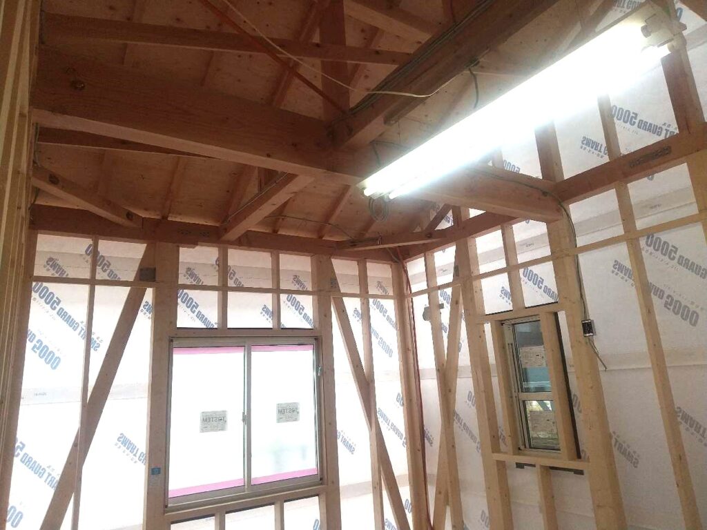 写真のように、上棟後の骨組みの中に配線が進み、少しずつ住まいの形が整ってきています✨